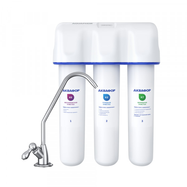 Обратноосмотические фильтры используются для абсолютной защиты от накипи, т.к. полностью устраняют соли жесткости из воды.нетЧисло ступеней очисткиКартриджи последовательно очищают воду и от видимых примесей, и от растворенных. Первый картридж задерживает более крупные частицы, а каждый последующий - более мелкие. Чем больше ступеней - тем лучше фильтр очистит воду: поймает более мелкие видимые частицы ржавчины, песка и ила, успеет захватить из воды максимум растворенных примесей - хлора, нитратов, тяжелых металлов и других.3МинерализацияПроисходит после финишной очистки воды. Необходима прежде всего в фильтре обратного осмоса, поскольку такой фильтр полностью устраняет из воды все примеси, в том числе минералы. Минералы добавляются в оптимальной концентрации - для пользы и привычного вкуса воды.нетПостфильтрацияФинальный этап очистки воды: картриджи постфильтрации удаляют самые мелкие механические частицы и кондиционируют воду, придавая ей более приятный вкус.нетНакопительная емкостьОбычно нужна в фильтрах обратного осмоса. Глубокая фильтрация требует времени. Чтобы Вам не приходилось ждать, пока вода наберется в чайник или кастрюлю, почти во всех моделях используется накопительный бак для чистой воды или другая емкость. В стандартном фильтре обратного осмоса под мойку воды в баке достаточно для семьи из 5-6 человек.нетФильтрующий модуль в комплектедаОтдельный крандаДавление в водопроводе не более, атмМаксимальное давление воды на входе в систему, при котором возможна стабильная работа фильтра.6,5Ширина, смОбратите внимание на габариты фильтра, и измерьте, сколько свободного пространства в предполагаемом месте установки.28,0Глубина, смОбратите внимание на габариты фильтра, и измерьте, сколько свободного пространства в предполагаемом месте установки.10,5Защита корпуса от гидроударовдаИсходная водаЖесткая вода – вода с избытком минеральных солей. От нее появляется накипь в чайнике, известковый налет на сантехнике и разводы на посуде. Мягкая вода – та, в которой мало минеральных солей. Нет накипи в чайнике и разводов на посуде. Фильтры для мутной воды и фильтры от ржавчины, как правило, имеют несколько стадий очистки и дополнительный полипропиленовый картридж. Он задерживает механические частицы ила, песка и ржавчины и защищает картриджи более глубокой очистки.мягкаяУстраняет мутностьМутность водопроводной воды может говорить о том, что в ней много мелких механических частиц. Важно, чтобы в фильтре был установлен дополнительные картридж механической предфильтрации (полипропиленовый) - он продлит жизнь остальным картриджам более тонкой очистки.даУстраняет ржавчину, бурый осадокЛюбой фильтр под мойку удалит из воды крупные и мелкие частицы ржавчины. Некоторые фильтры имеют повышенный ресурс по железу: они дольше служат в такой воде, поскольку лучше подходят для удаления из воды железа и механических частиц ржавчины.нетЗащита от бактерийВсе проточные фильтры в той или иной степени защищают от бактерий. Например, добавление серебра препятствует их размножению. Это стандартная степень защиты. Если в семье есть дети, пожилые люди или аллергики, воду рекомендуется обеззараживать, то есть полностью удалять микроорганизмы. Повышенную защиту от бактерий дают фильтры с половолоконной мембраной. Это пучок труб