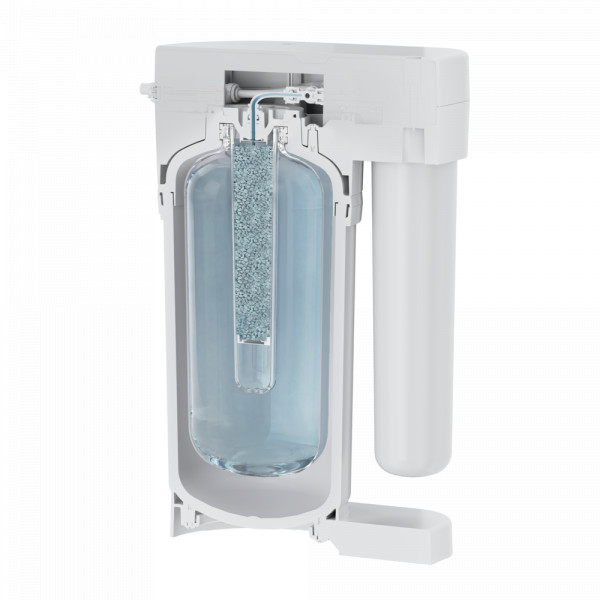За глубокую очистку и умягчение отвечает мембрана KO-50S. Ее производительность достигает 190 литров в сутки (7,8 л/ч). Мембрана удаляет из водопроводной воды соли жесткости, предотвращая образование накипи в чайнике, кофемашине, утюге, отпаривателе, а также исключает появление белого осадка при работе увлажнителя воздуха.